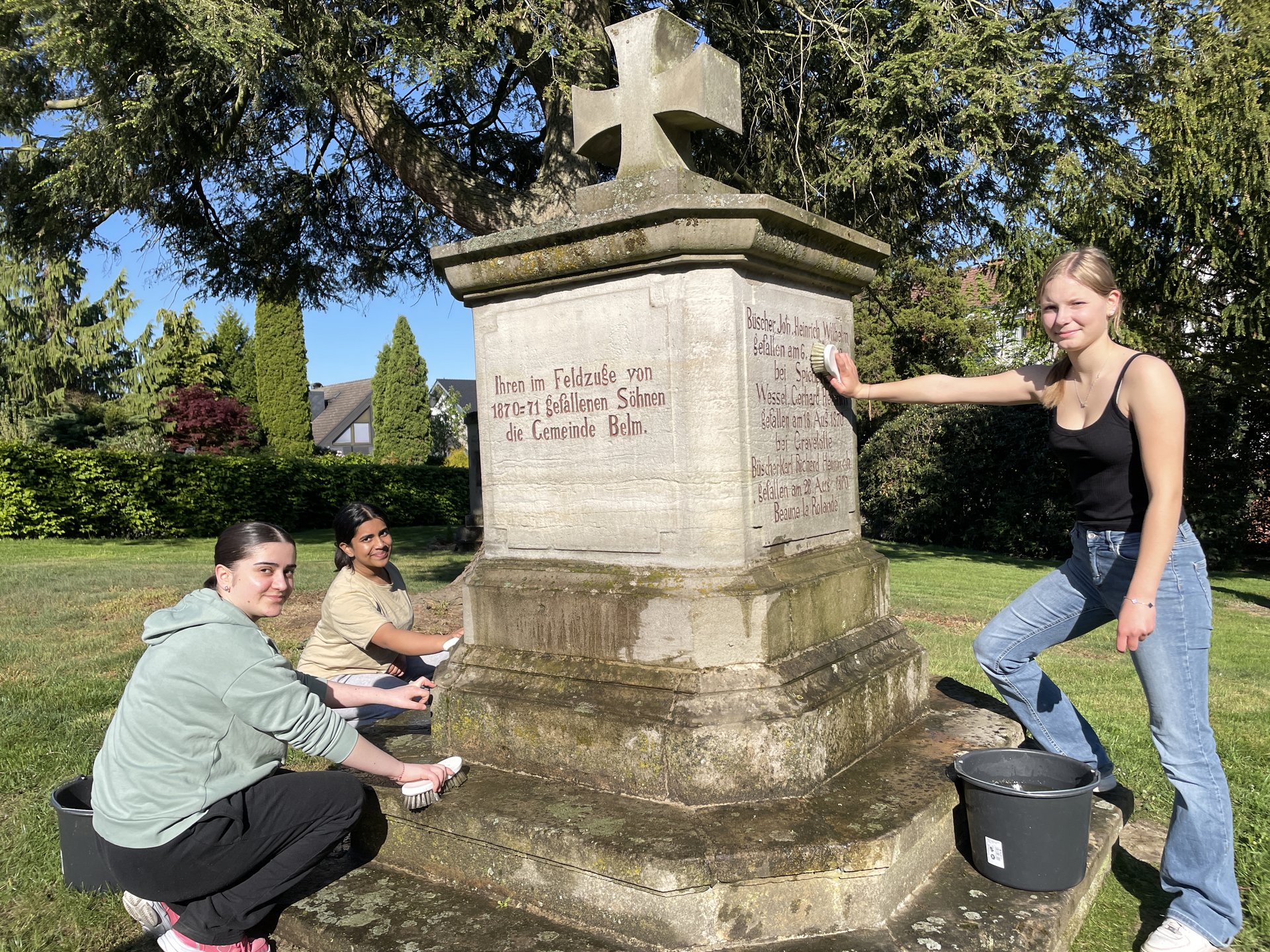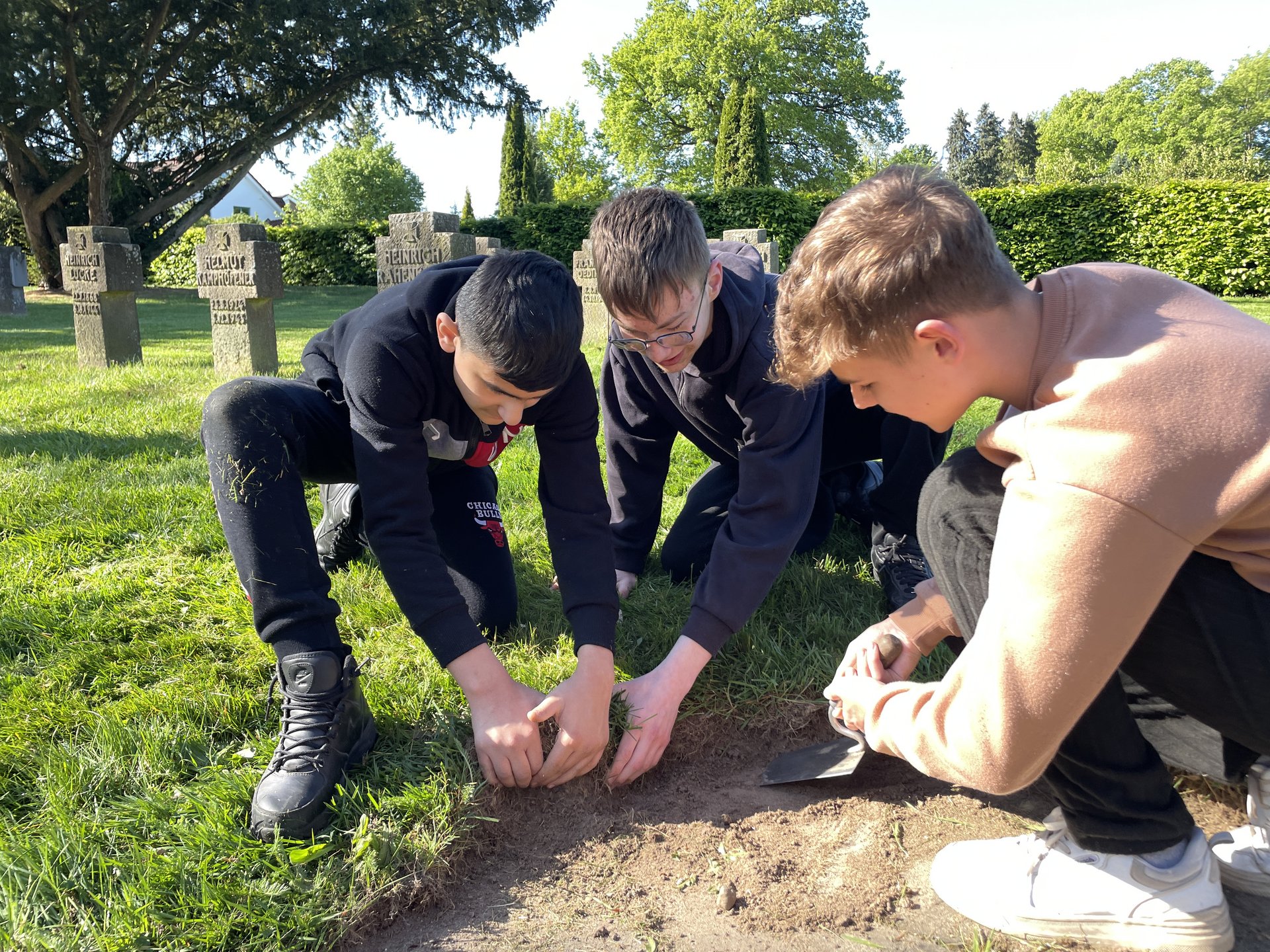Das Ende des Zweiten Weltkriegs in Europa vor 80 Jahren am 8. Mai 1945 begingen alle Schüler der Oberschule Belm mit einem Projekttag. Die Klassen 7O3 und 8G1 hatten sich entschlossen, das Areal um das Ehrenmal für die gefallenen Soldaten auf dem Belmer Friedhof zu pflegen. Sie kannten das Gelände von Unterrichtsgängen zum Thema „Trauer“ aus dem Religionsunterricht – ebenso wie den Zustand.
