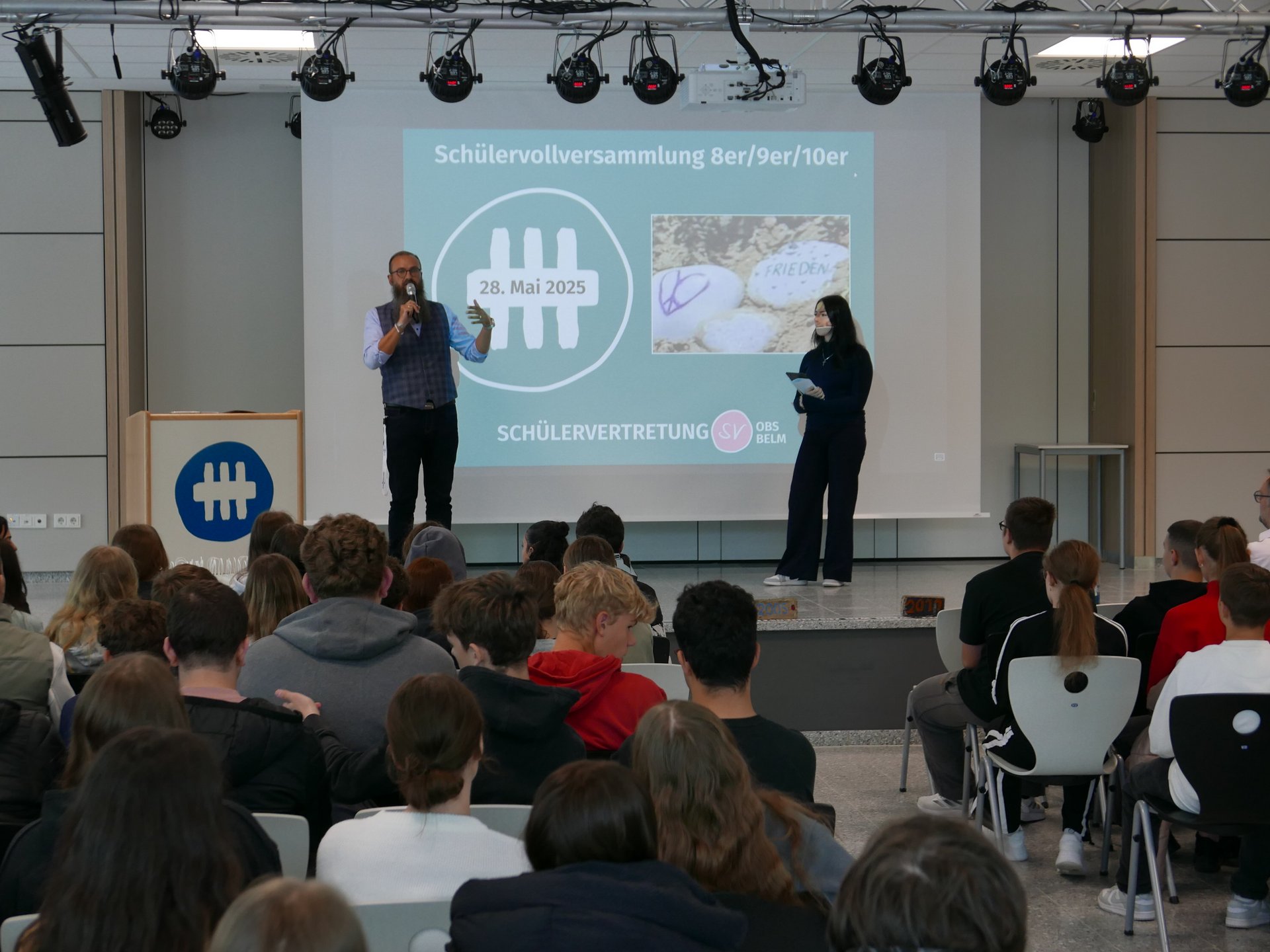 Nach den Projekttagen folgte für die Schülerinnen und Schüler der Klasse 9G1 aus dem gymnasialen Zweig eine besondere Veranstaltung, die ihr Engagement würdigen sollte. Ihnen wurden während einer Schülervollversammlung der Jahrgänge 8 bis 10 auf der Bühne in der Mensa für ihre Beteiligung an der Haus- und Straßensammlung 2024 Urkunden verliehen.