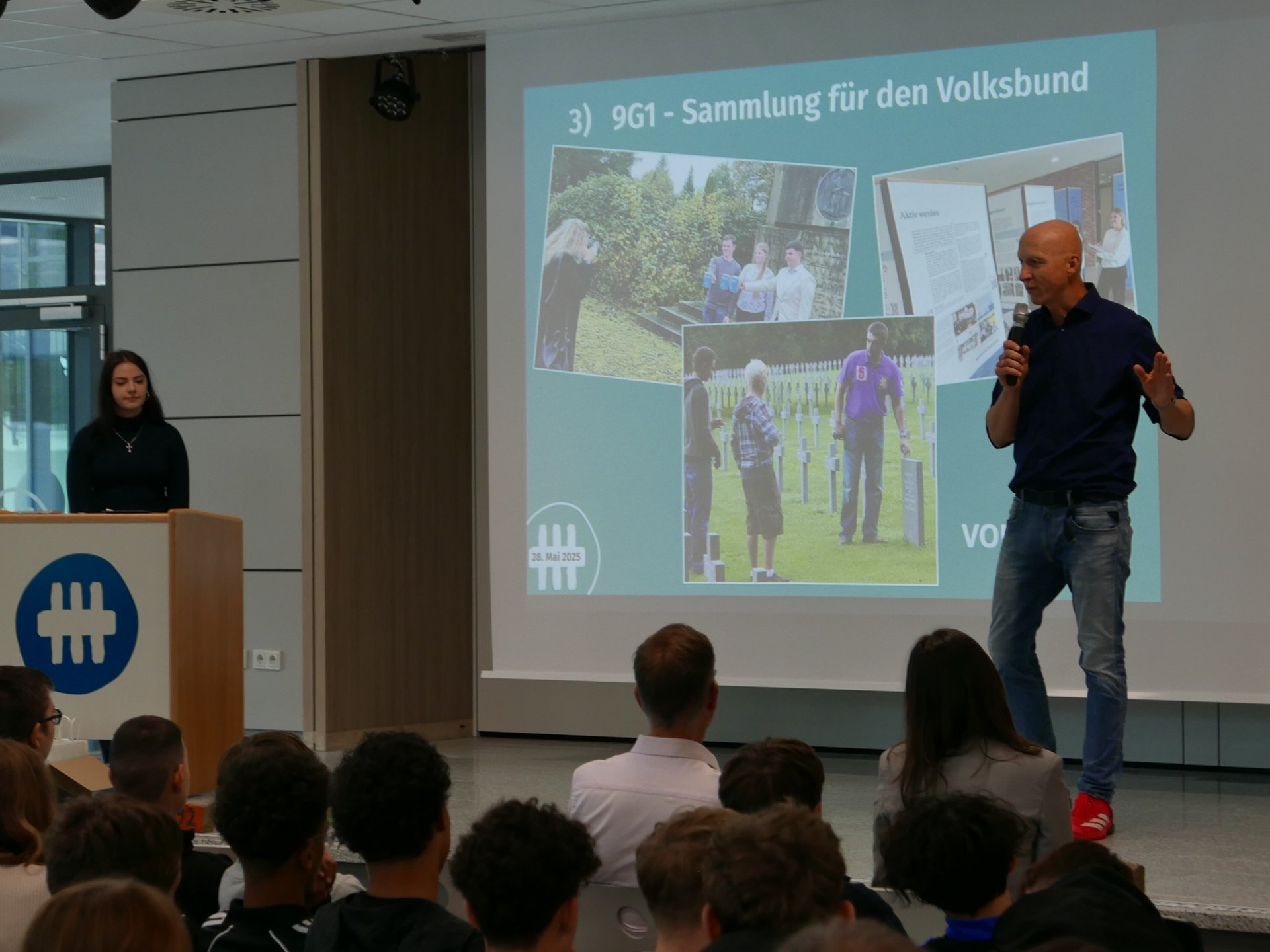 Der Schulleiter Jörg Ringling eröffnete die Veranstaltung, indem er in seiner Ansprache die Wichtigkeit von Frieden und Demokratie thematisierte.