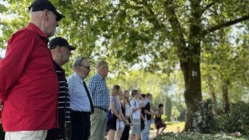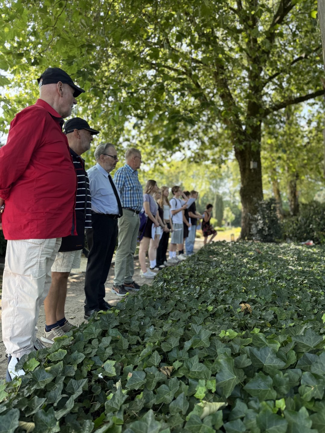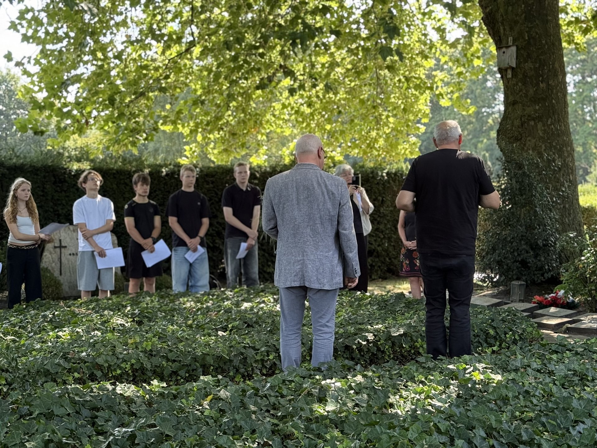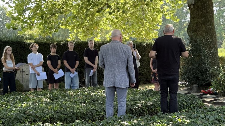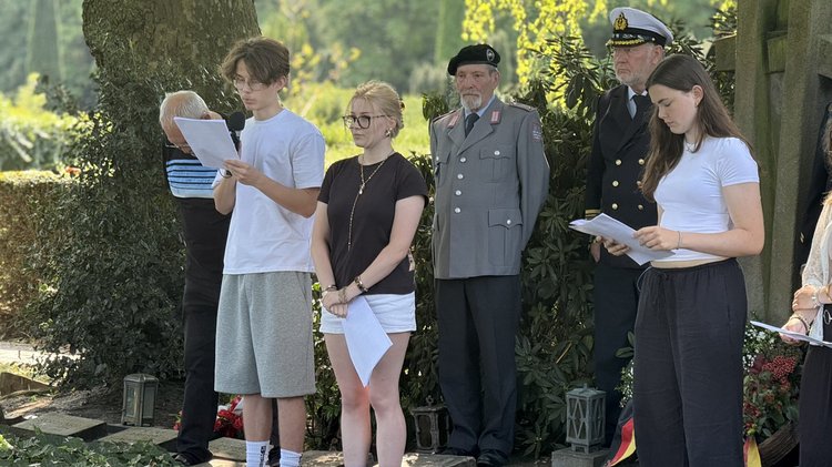 Schülerinnen und Schüler des Windthorst Gymnasiums forschten in den vergangenen Monaten zur Kriegsgräberstätte. Unterstützt wurden sie dabei von ihren Mitschülerinnen und -Schüler ihrer Partnerschule aus Ostroleka in Polen. Gemeinsam erarbeiteten sie sich Informationen und organisierten einen Schülerbeitrag für die diesjährige Gedenkveranstaltung. Entsprechend wurde der Beitrag zweisprachig gestaltet und letztlich sogar vorgetragen.